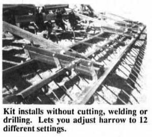 A kit includes all brackets and bolts to fit 6 carrying arms, or three sections. Sells for $398. The first kits were built to fit 3-bar tine harrows behind Case/IH field cultivators and disks because that's what the three farmer-inventors own. However, they're taking orders for other makes and models.