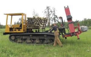 He removed the Morooka crawler's standard cargo box and mounted a home-built post-carrying rack on the frame behind the cab. This allows him to carry an 80-post bundle.