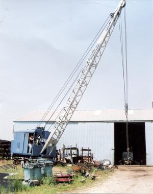 He picked up an old crane for next to nothing because it had a frozen Buda engine. He had a truck that had been hit by a train but still had a good engine. He traded the truck for the crane and kept the engine. He installed it in the crane which now works perfectly, positioned off to the side of the opening to his shop.