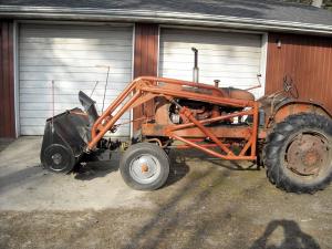 He recognized the danger of accidentally lifting the loader-mounted blower too high and damaging the shaft. To prevent that, he installed two stop chains between the loader frame and the tractor frame.