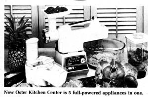 For blending, the Kitchen Center Osterizer is available in .10 or 12 speeds with "control cycle" blending at all speeds for processing food to the desired texture. Its large 5-speed glass container opens at both ends for easy emptying and cleaning.
