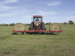 The rear-mount toolbar features a wing with bale spears facing forward on either side. The operator lowers the toolbar to the ground and drives forward sliding the spears under the bales. Once loaded, the toolbar is raised, and the wing folds back on the bar. With the bales now paired and behind the tractor, they can be carried off the field. Simply lower the toolbar to the ground, and the bales slide off.