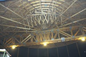 They came up with a plan for 22 rafters joining at the center for a clear span roof. The design included framing in a 15-ft. wide by 16-ft. high doorway.