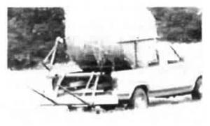 A 10,000-lb. 12-volt electric winch is used to operate a bale fork at the back of the truck. The winch mounts on the front corner of the box. The cable runs back to a lift arm mounted on the side of the fork. It lifts up the first bale into a "cradle" mounted at the front of the pickup bed. Bourne then picks up a second bale - either from the side or the end - and raises it up at an angle, so the bale can't roll off in transit.