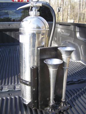 The fire extinguisher builds up to 100 lbs. of pressure. Jones cut the spray nozzle off the hose and inserted a 3-in. long copper tube that hooks up to a pair of air horns off an old fire truck. A manifold splits the air to the horns.
