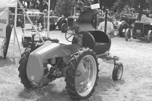 He started with a 1948 Allis Chalmers G, which was designed with a rear-mounted engine and transmission and an arched pipe frame on front for increased visibility. Attachments, such as a cultivator, could be belly-mounted on a toolbar between the front and rear wheels. He unbolted the frame and the front axle, and then built a new frame with brackets to support the grille. He also installed a used front axle that he bought at a salvage yard.