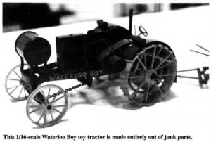 Built-From-Scratch Toy Waterloo Boy FARM HOME Novelty Items 19-2-20 What makes this built-from-scratch Waterloo Boy toy tractor unique is that the man who made it, Don Selle, Turtle Lake, Wis., built it entirely out of "junk" parts including old tachometer gauges, nails, washers, electric fence wire, baling wire, etc.