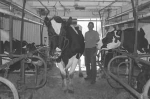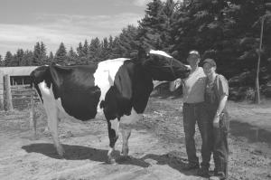 Hallie lives outside because she’s too big for the stalls. When he milks her, Titera leads her to the center of the barn and brings the machine to her. She is a gentle cow, he says, and well trained. When his daughter, Anna, was young, she worked with Hallie and took her to shows. They have a special bond, and Hallie comes to Anna whenever she is home.