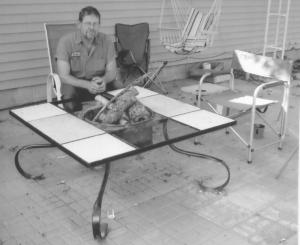 The legs arch gracefully under the 4-ft. sq. tabletop and are painted black. The table itself is lined with off-white, ceramic tile squares on top and includes a firewood burner – the top third of a 30-gal. steel barrel – in the middle.