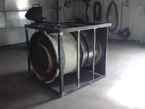 Luschen creates a dead air space for the heated air to circulate, between his wheel firebox and an insulated box. He builds a frame of angle iron, covered with metal and makes a second frame and fills the area between with sand or dirt. Or, he pours a cement foundation and builds concrete block walls with a cement roof and boxes in the front with metal. It’s important to let the cement cure for a couple of months before using the stove, he notes.