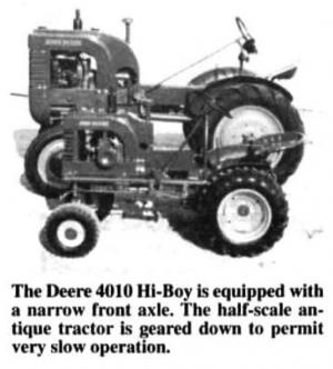 The Deere 4010 Hi-Boy is equipped with a chain-driven, reduction gearbox on each wheel. "It's really fun to drive because it can go so slow. You can hardly tell the tractor is moving," says Zink. "At shows we sometimes turn the steering wheel all the way to the right and use a rubber strap to lock it into position, allowing the tractor to turn around and around in a tight circle without a driver."