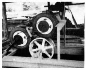 I designed this drive unit for a belt-powered sawmill several years ago and have sawed over 150,000 ft. of wood with no problems at all. !was looking for something that would be easier to use than a flat belt because they would always run off the pulley and had to be so carefully lined up. I wanted to use the same tractor for handling logs and powering the saw. Now I can change from moving logs and lumber to sawing wood in less than a minute with my Massey Ferguson 285 tractor. The tricky part in designing the drive was figuring out how much tire contact was needed to transmit the power of the 85 hp. tractor to the saw drive pulley. Two tires with 1-ton dish wheels attach to 3/4-ton axle housings mounted on a 7-ft. long 8-in. H-beam. A 48-tooth RC60 sprocket bolts to the center of each wheel. Adrive chain, held tight by an idler wheel, runs between the two sprockets.