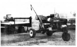 Asbury' s "mini crane" is equipped with the Jeep's 30 hp 4-cyl. gas engine, 4-speed transmission, and two of the wheels. The single tractor wheel mounts on the back end of the crane controlled by the Volkswagen steering box (which is hooked up to the Case tractor steering assembly). A 12-ft. boom mounts in front of driver, equipped with an electric winch that runs off the rig's 12-volt battery.