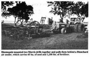 "It works as good as any air seeder on the market. I spent only $8,500 to build it," says Rudi Bloomquist, Starkweather, N. Dak., who converted two 11-ft. Morris hoe drills into a state-of-the-art air seeder by removing the seed boxes and metering drives and mounting a pair of seed-distributing manifolds on the drill frame. A two-compartment Blanchard air seeder caddy delivers seed and fertilizer to the manifolds which then distribute them through tubes to each hoe opener.