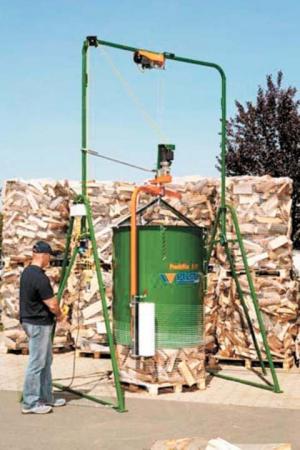 The PackFix drum sets under a sturdy metal frame with a winch that raises and lowers the drum after it’s filled. The drum can be filled with pieces of split firewood 8 to 20 in. long by hand or with a conveyor. When the drum is full, the operator raises it with the remote-controlled winch while a wrapping arm automatically circles the drum and applies plastic netting. When the drum clears the top of the bundle the net is cut and tied to secure the bundle on the pallet.