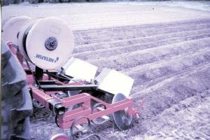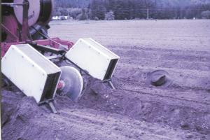 “The thrown dirt slides off the plastic, and the front of the boxes are angled so they would skid over the tilled field surface,” explains Ratcliff. “One person can walk along the trench and toss potato pieces in while a second person pulls the trench sides down over them.”