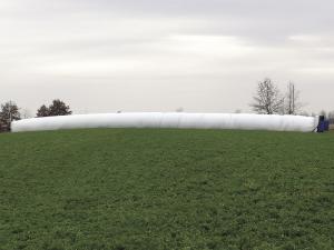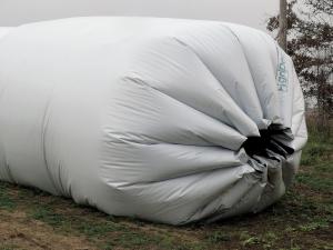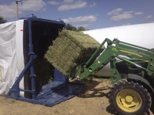 The Air Barn system consists of the bagger frame, fan, fan stand, and bag. The operator uses a front-end loader to load bales into the loader’s bale chamber, and then uses the loader bucket to pull the bagger backward to make room for more bales. The process is repeated until the tube is filled, and then the finished end of the bag is closed to the desired diameter to control air flow.