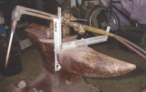 The one-piece attachment slips over the horn of the anvil and rests on top of it. It consists of an L-shaped angle iron bracket with 2 small tabs that hold the torch in place. The tabs are made from 3/32-in. material and are 3/4 in. wide and about 1-in. long. One tab slips into the base area of the torch, between two hoses that supply oxygen and acetylene, while the other tab slips into a space in the torch head.