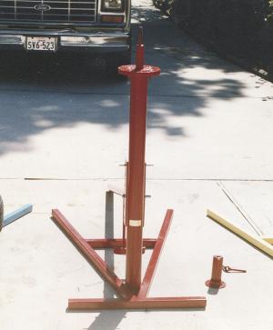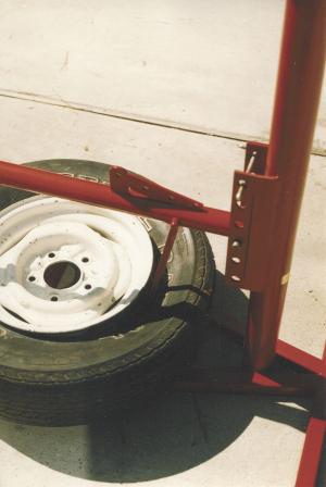 He uses leverage with his design that he calls a Tire Break Down. It’s made of round and square tubing. The tire is placed on the “feet,” and the handle is secured with a bolt to one of six holes according to the tire width. A lever slips between the rim and the tire. By pushing the handle down, the lever breaks the tire’s seal. Turn the tire over and repeat to break the seal on the other side.