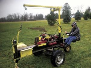 The self-propelled wood handler is powered by a 12 1/2 hp gas engine salvaged from an old White riding mower. The engine direct-drives a hydraulic pump that drives the rear end off an old Ford pickup. The pump also operates a 5-in. hydraulic cylinder that drives the splitting wedge, and a crane fitted with tongs that are used to lift heavy chunks onto the splitter table. Cable runs from the arm down to a hydraulic motor-powered spool mounted under a horizontal arm. The crane can be spun all the way around and, by pulling a couple of pins, can be folded flat for transport.