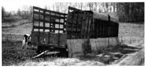 "I got the idea a few years ago when we started feeding big round bales out in our cattle yard. Cattle had to go out in sub-zero weather to feed, but strong winds would discourage them from eating. These wagons give almost perfect shelter. I added chipboard sheets along the bottom of the wagons to provide even better shelter. Now when the cattle feed behind the wagons, they're almost completely out of the wind," says Gumbert.