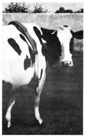 Electrodes - one on either side - hang down below the cow's belly from a belt that wraps around her middle. When they come in contact with a wet surface, the electrical circuit is completed. The cow receives a shock on the upper part of her back from a pair of metal contacts on the underside of the belt. It's not enough to hurt the animal, says Jean-Marc Liegeois of NOE, the distributor. It's just enough to get her to move.