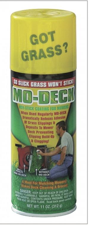 MDI Products, 36 Hovey Rd., Monson, Mass. 01057 (ph 866 213-0772; www.mo-deck.com): Grass has a tougher time building up under mower decks treated with Mo-Deck aerosol undercoat, says the company. It keeps wet grass from sticking to the deck and greatly reduces the need to do any power washing or scraping to get the deck and blades clean.