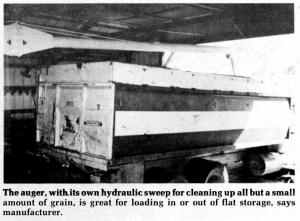 The hydraulic system which controls the unit is an engineering marvel. The operator can hydraulically raise or lower either end of the unit, thus eliminating the need for any manual positioning or jockeying. In flat storage, for example, the auger can be operated horizontally to load grain in or out of the farthest end (see photos). If you're loading grain out of flat storage into a semi, the auger will completely load the truck lengthwise without having to stop periodically to reposition the truck.