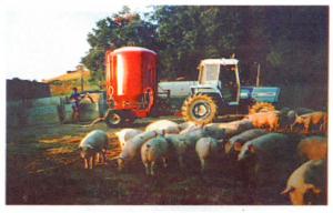 The air feeder eliminates the need to line up an unloading auger which sometimes takes longer to do than filling the feeder. It consists of a large sealed tank that's filled through a porthole on top. Once the top port is closed, a pto-driven air pump pressurizes the tank, forcing feed out a flexible feed hose with an open-shut valve on the end that the operator can control as he walks from feeder to feeder.
