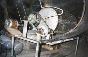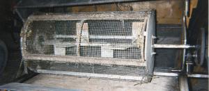 He dumps peas in through a door on a section of the drum, levels them out, and turns on the motor. The drum rotates slowly with belts and pulleys, and when the peas spin to the top, they fall on the fast moving paddles and hit against the screen, which opens the pods. The shelled peas fall through the screen into the drawer.