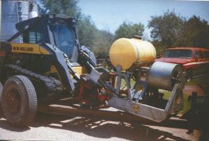 The sprayer hooks up to the 3-pt. hitch off a Belarus tractor. Hardenburger modified the 3-pt. so he could attach it to the skid loader’s quick-tach brackets.