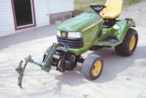 The turf cutter is simply a shank and housing off an old cultivator given to him by a farmer friend. Haney did a little welding to fabricate a mount that matched the existing mount for the hydraulic front blade on his X728 Deere.