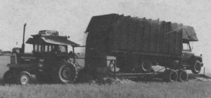 Piggyback Chaff Truck TRUCKS New Trucks 8-2-7 We have to travel up to 16 miles to haul chaff in from our farthest fields," says Peter Leismeister, Consul, Sask., who, along with his brother Tony, devised a way to blow grain chaff into a 3-ton International truck which rides piggyback behind a converted Hesston Stakhand.