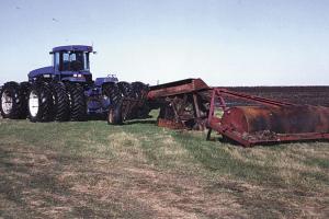 Chuckry needed something that would bury the approximately 3-ft. layer of peat covering his fields and bring about 6 in. of clay to the surface. To make the deep plow, he modified a "breaking plow" that originally made a single furrow 26 in. deep and 42 in. wide. He increased the size of the moldboard and welded a 15-ft. long steel I-beam on top of the plow's main beam to keep it from twisting under the increased load. An 18-ft. wide, 40-in. dia. steel roller trails behind the plow. Chuckry uses a 400 hp Ford 9880 tractor equipped with triple 20.8 by 42 radial tires all the way around to pull the plow and roller. The inside 8 wheels are filled with fluid, and the tractor is fitted with almost 5,000 lbs. of suitcase weights on front. Fully loaded, the tractor weighs 41,500 lbs.