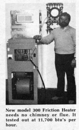 The company says its new design is simpler and presents more surface area with which to create friction, and thus heat. The new design has been incorporated into the just-introduced Model 300 Friction Heater from Hedstrom-Powell. Since no flames or gasses are involved, it requires no chimney or flue, according to Lou Powell, coowner. It's driven by a 3 hp. electric motor (220V) on the heat producing rotor and a 1 hp electric motor (110V) on the fan. "It's designed to heat a properly insulated 1,200 sq. ft. home," says Powell. Suggested retail is $1,852. Current models are being manufactured for Hedstrom-Powell by Nebraska Engineering, of Omaha.