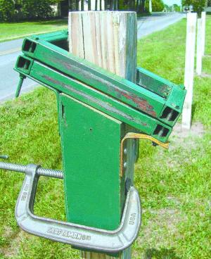 Cut-Off Template Helps Make Uniform Fence Posts FENCING Miscellaneous Along with a couple of other volunteers I was helping redo a fence around a local graveyard We needed to set 36 4 by 4 posts to the same height We also wanted the posts to be angled at the top to shed water Since no one had a circular saw big enough to cut through the posts with one pass I decided to make a jig to do the job with a reciprocating saw I started by welding together two rectangular boxes big enough to fit over the posts out of 1-in sq tubing I bolted them together with washers between so there’s just enough room for a saw blade The boxes are long enough to allow the blade to cut through without hitting the bolts that hold them together The narrow slots keep the saw blade from wandering To get the right angle I bolted the template to a couple of short angled 2 by 4’s and a piece of plywood that connects them Then I attach the whole assembly to the post with a C-clamp We snapped a chalk line along the outside of the posts to align the template The idea cost me nothing worked great and the cuts came out very uniform The new fence looks great Contact: FARM SHOW Followup Philip Whitmoyer 236 Ziegler Road Leesport Penn 19533 ph 610 926-1014