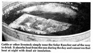 The inflatable plastic bag is designed to collect the sun's heat and transfer it to the water. "The clear vinyl top admits radiation from the sun, traps it in the black bottom, then transfers it by conduction to the water," explains Carmack. "If a crust of ice forms in the night, the Solar Rancher will usually melt it within an hour or two after sunup. On the average, it adds over 700 btu's pei square ft. per day to your watering tank.