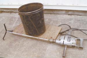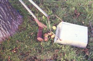 His walnut shucking system includes an 8-in. wide, long-handled “putter”. It’s used to shove walnuts into a 10-in. wide , long-handled “dust pan” which lays flat on the ground. Nuts are dumped into a 5-gal. pail and a drill-powered shucker is then used inside the pail to knock the shells off.