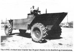 Kim says they needed a way to get around their farm, which is mostly river bottom land, in the spring when it's usually flooded. "There can be anywhere from a few inches of water to several feet. Sometimes it requires a boat, sometimes a tractor, but we had nothing to get around in until we built this go-anywhere machine."The 30-ft. long tractor-boat can cruise down the road at 50 mph, claw through muck halfway up its 38-in. tires, climb over 6-ft. tall embankments, or navigate in 16-ft. deep water. When fields on the southern Illinois farm- are separated by bodies of water, the huge 9 1/2 ft. wide machine often runs through heavy mud one minute and deep water the next. Even though it weighs 16,000 lbs., "The Ultimate", as the Bicketts call it, never gets stuck. Components from several military ve¡hicles were used on the home-built tractor which is 4-WD, 4-wheel steer and has 24 gears. It's powered by a 454 Chevrolet engine. The front and rear axles were salvaged from a 10-ton Mack truck, and they're steered hydraulically. There's two transmissions - one automatic and the other a 4-speed - as well as a 2-speed transfer case. Tires are 18.4 by 38 in. with rice treads, mounted backwards for better action in the water. "We've carried 10 men on it at once in the water and it would carry more," says Kim. The tractor goes 3 to 4 mph in water, float¡ing on the boat-shaped center body of the machine. Kim says he may add propellers for faster speed in water. He still doesn't know what the long-term effects of water will be on the newly-built machine but as a precaution he greases liberally and frequently checks oil in the gearboxes.The Bicketts use the tractor to move irri¡gation pipe, check levies, transport equip¡ment, and to pull other vehicles out of the mud. It has enough power to pull out tractors sunk into mud up to their frames, as it recently did for a neighbor.Eventually Bicket plans to enclose the passenger and driver areas with a cab and install fenders to protect riders from getting .a mud bath.The tractor has both a straight hitch and ball hitch on back. Contact: FARM SHOW Followup, Kim Bickett, Rt. 1, Box 78, Ridgway, Ill. 62979 (ph 618 272-7546).