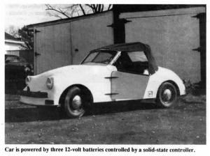 "The three 12-volt batteries driving this car are controlled by a solid-state controller. Another 12-volt battery is used for lights, horns, and accessories. Two of the batteries mount in front of the car and two at the rear for better weight distribution. The car has a range of about 50 miles between charges. It passed our state vehicle inspection requirements so it's licensed for legal driving on the highway. It goes up to 35 mph.