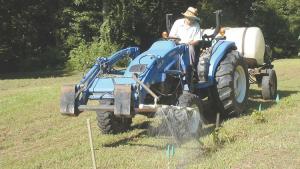 Lehman recognized a labor and time-saving opportunity when his neighbor wanted $125 for his field sprayer, complete with a power takeoff pump. Lehman bought it and removed the field spray booms, feed hose, pressure gauge and regulator. He kept the in-line filter and hose to the pump and added valves and hose barbs to the pump output to turn each outlet on and off. He made the watering wand out of 2-in. pvc pipe, lined with inexpensive showerheads. The pipe mounts on the side of his tractor’s loader and is connected to the pump with a 1-in. ID flexible hose.