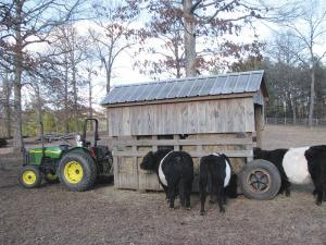 He started with an old 4 by 10-ft. steel mason’s mortar mixing pan. He welded the front axle and wheels off an old Ford F-700 dump truck onto one end and an old pintle hitch ring to the other. He then used roughcut pine boards from his sawmill to build the 10-ft. tall feeder, adding a gabled top enclosure that’s covered by reclaimed metal roofing. The feeder is open at both ends where bales are loaded in.