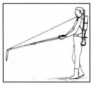 Developed primarily for applying Roundup, it consists of a 15 liter back-pack tank and a first-of-its-kind dowsing wand. Connected to the unit by a spring balance, It's almost weightless. With a reach of 1.5 meters, the nozzle at the end of the dowsing wand dabs leaves so carefully that just 0.025 ml. of herbicide is used per leaf. The rate of application allows a 1.5 liter tankful of Roundup to treat about 60,000 weed plants.