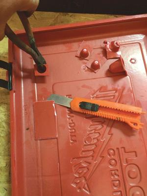 “I cut out any spot welds inside the tool case and use a pliers to remove any plastic plugs. I also trim away part of the tool case’s outer edge, making sure not to cut out too much so the tool case won’t lose its strength. Then I use sandpaper anywhere I’ve made a cut to remove the sharp edges. If the tool case’s hinges are broken, I make new ones by screwing on pieces of old shoe leather.”