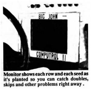 "Other monitors show the total number of seeds dropped per row and the average seed spacing. However, this doesn't mean your planter is placing seed properly," says Kevin Blair, the farmer who invented the new monitor and licensed it to Big John Mfg., Inc. "It lets you watch each row unit perform and helps you analyze any problems that crop up."
