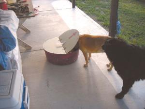 While the whole project only took about 45 min., teaching the dogs to use it took more than a week. For the first few days, the lid was left open so they learned the food was in the tub. Hoard then used a small piece of 4 by 4 to keep the door partly open. After a few days he replaced the 4 by 4 with a 2 by 2. A few days later it was removed, and the dogs began to push the lid open on their own.