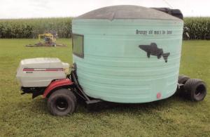 “I had a dream one night of a water tank on a lake, and the next morning I went outside and saw the old mower and the tank and decided to put ‘em together,” says Davis.