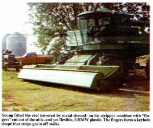 Young started with a 22-ft. wide Deere 222 grain header and fitted it with his home-built stripper reel fitted with heavy plastic "fingers" that strip the stalks yet leave them standing. The biggest benefit of the process is that less crop material feeds through the combine so you can go faster and do a better job cleaning.
