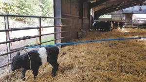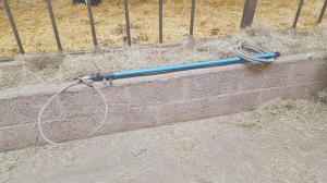 The telescopic pole, made from a plastic pipe, reaches to 25 ft. and has a rope lasso threaded through its center to hook around the calf’s neck, allowing the operator to stand safely outside the pen.
