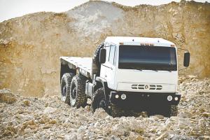 The 7-speed automatic trucks are available in 4-WD or 6-WD with up to 330 hp. turbo-charged Caterpillar 7.2L diesel engines. They have 46-in. tires, 14 in. of ground clearance and can go through up to 50 in. of water and climb a 60 percent grade at full load. With a central tire inflation system, the tires can be pumped up for travel up to 74 mph on paved roads, then reduced to a lower tire pressure for travel on rough terrain and soft ground.
